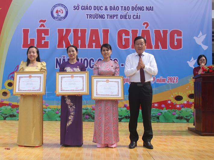 Ủy viên Ban TVTU, Trưởng Ban Tổ chức Tỉnh ủy Đào Văn Phước thay mặt lãnh đạo tỉnh trao tặng danh hiệu Chiến sỹ thi đua cấp tỉnh các giáo viên đạt thành tích của Trường THPT Điểu Cải (H.Định Quán) trong năm học vừa qua