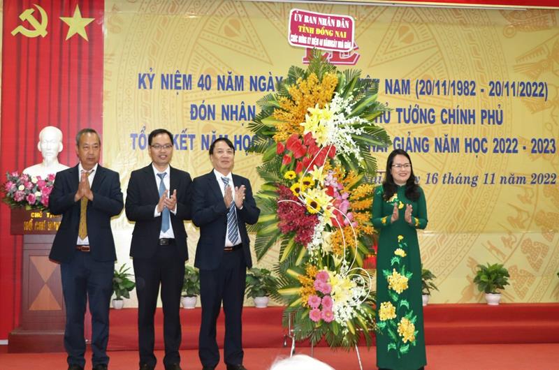 Bà Nguyễn Thị Mộng Thu, Phó giám đốc Sở LĐTB-XH tặng lẵng hoa chúc mừng của UBND tỉnh Đồng Nai cho tập thể Trường cao đẳng Cơ giới và Thủy lợi