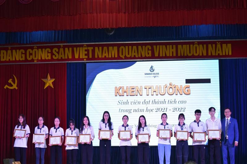 Đại diện Ban giám hiệu Trường Cao đẳng Công nghệ và quản trị Sonadezi khen thưởng cho các sinh viên có thành tích học tập xuất sắc, giỏi trong năm học 2021-2022