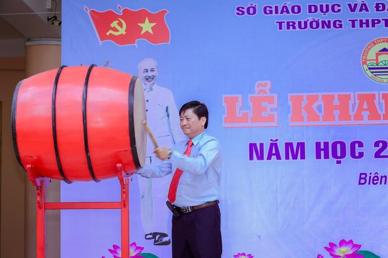 Thầy Phan Trọng Nghĩa, Hiệu trưởng Trường THPT Ngô Quyền đánh trống khai giảng năm học mới