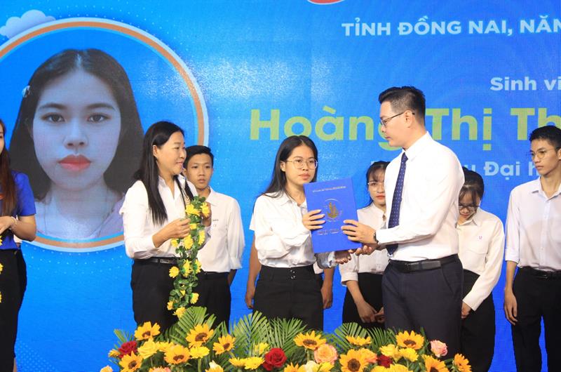 Anh Võ Văn Trung (bìa phải), Phó bí thư thường trực Tỉnh đoàn, Chủ tịch Hội Sinh viên tỉnh và đại diện Ban Dân vận Tỉnh ủy trao chứng nhận và hoa cho các sinh viên đạt danh hiệu sinh viên 5 tốt
