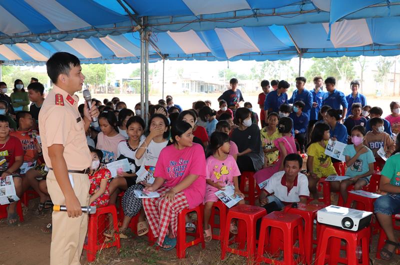 Đội Cảnh sát giao thông - trật tự Công an H.Long Thành tuyên truyền, phổ biến pháp luật về giao thông cho các em học sinh trên địa bàn xã Phước Bình (H.Long Thành)
