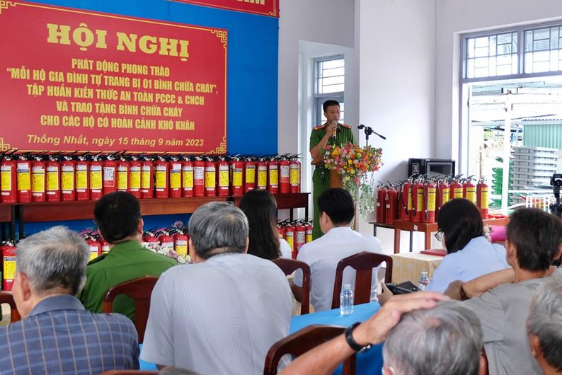 (CTT-Đồng Nai) - Công an TP.Biên Hòa và UBND P.Thống Nhất vừa tổ chức tuyên truyền, hướng dẫn hàng trăm hộ dân địa phương các kỹ năng thoát hiểm cũng như các biện pháp đảm bảo an toàn PCCC tại nhà. Dịp này trao tặng 240 bình chữa cháy xách tay cho các hộ nghèo, hộ cận nghèo và hộ có hoàn cảnh khó khăn ở P.Thống Nhất.