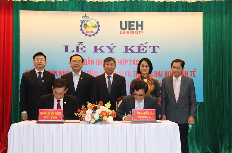 Lãnh đạo UBND tỉnh Đồng Nai và lãnh đạo Trường Đại học Kinh tế TP.HCM thực hiện ký kết bản ghi nhớ hợp tác giai đoạn 2023-2026