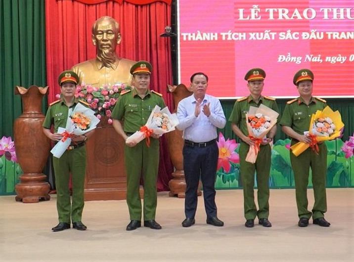 Quyền Chủ tịch UBND tỉnh Đồng Nai Võ Tấn Đức trao thưởng cho đại diện các đơn vị tham gia vụ bắt đối tượng bắt cóc trẻ em