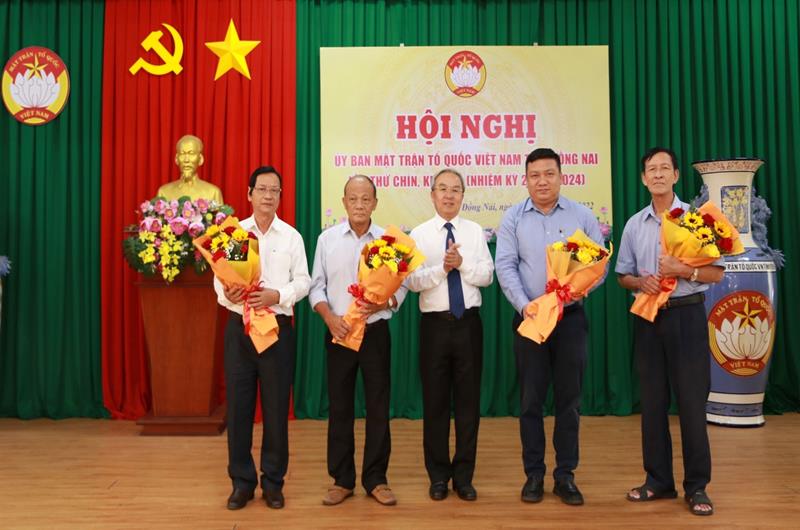 Chủ tịch Ủy ban MTTQ Việt Nam tỉnh Cao Văn Quang tặng hoa chúc mừng 4 cá nhân tham gia Ủy viên Ủy ban MTTQ Việt Nam tỉnh Đồng Nai khóa IX (nhiệm kỳ 2019 - 2024)
