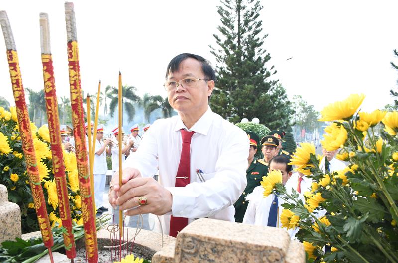 Phó Bí thư thường trực Tỉnh ủy Hồ Thanh Sơn thắp hương tại các mộ phần liệt sĩ đang an nghỉ tại nghĩa trang liệt sĩ tỉnh.