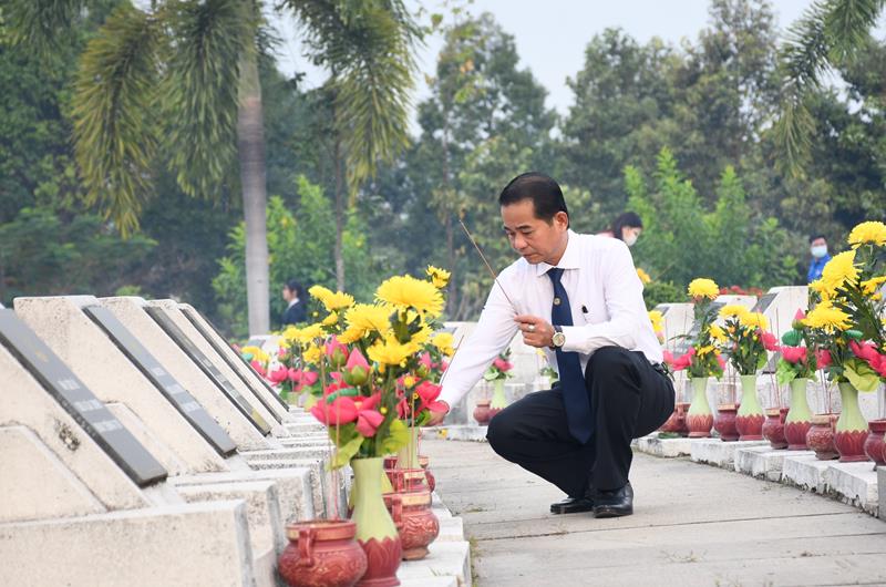 Chủ tịch HĐND tỉnh Thái Bảo thắp hương tại các mộ phần liệt sĩ đang an nghỉ tại nghĩa trang liệt sĩ tỉnh.