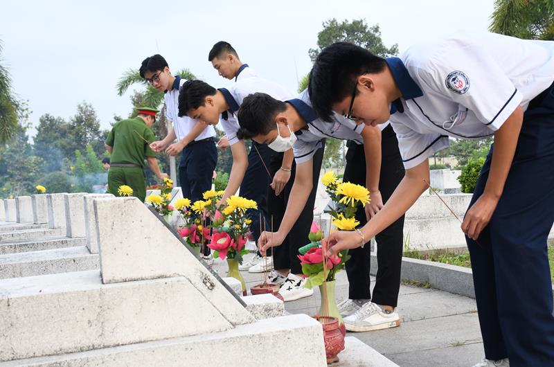 Các em học sinh đến thắp hương tại các mộ phần liệt sĩ tại nghĩa trang liệt sĩ tỉnh.