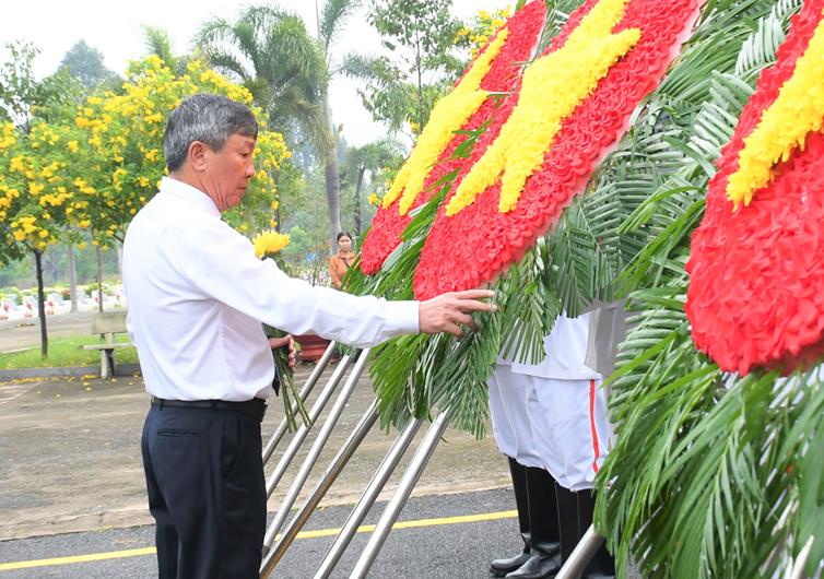 Phó Bí thư Thường trực Tỉnh ủy Hồ Thanh Sơn chỉnh hoa viếng các anh hùng liệt sĩ