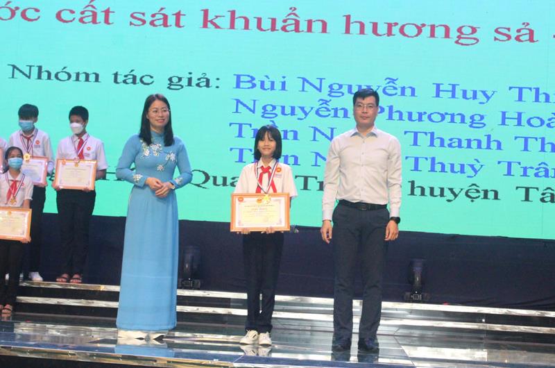 Các em học sinh thực hiện giải pháp Nước cất sát khuẩn từ hương sả, gừng nhận khen thưởng tại lễ trao giải Cuộc thi Sáng tạo thanh, thiếu niên, nhi đồng tỉnh Đồng Nai năm 2022