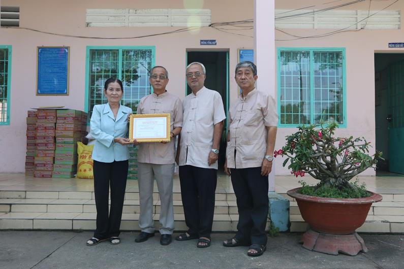 Những người cao tuổi trong Ban trị sự Thất phủ cổ miếu Biên Hòa, Ban liên lạc người Hoa TP.Biên Hòa trao tặng quà hỗ trợ cho đại diện Cô nhi viện Hoa Mai, xã Long Phước, H.Long Thành