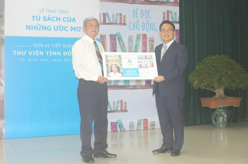 Giám đốc khối chiến lược và kế hoạch Công ty Tài chính TNHH MTV Shinhan Việt Nam Yang Hyung Mo (phải) tặng sách Thư viện Đồng Nai