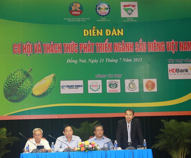 (CTT-Đồng Nai) - Ngày 21-7, Hội làm vườn Việt Nam, Hiệp hội rau quả Việt Nam và UBND tỉnh Đồng Nai phối hợp tổ chức diễn đàn “Cơ hội và thách thức phát triển ngành sầu riêng Việt Nam”. Tham dự diễn đàn có ông Lê Thanh Tùng, Phó Cục trưởng Cục trồng trọt (Bộ NN-PTNT), Phó Chủ tịch UBND tỉnh Đồng Nai Võ Văn Phi và đại diện các hiệp hội, lãnh đạo Sở NN-PTNT của 18 tỉnh, thành có diện tích trồng sầu riêng lớn cùng 250 đại biểu là doanh nghiệp, HTX, chủ trang trại trong và ngoài tỉnh.