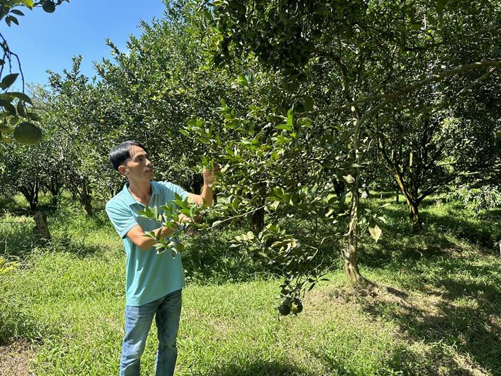 Anh Hà Thắng bên vườn quýt của HTX thương mại dịch vụ Bình Minh