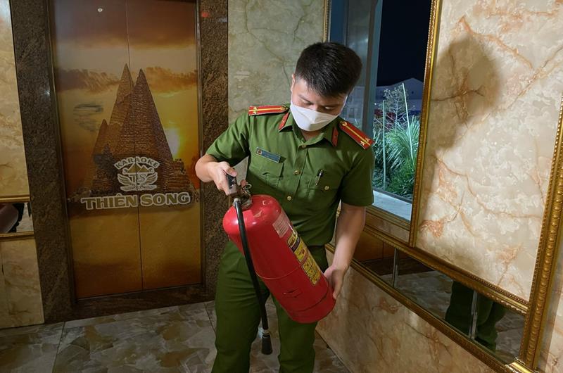 Công an TP.Biên Hòa kiểm tra thiết bị phòng cháy, chữa cháy tại một cơ sở kinh doanh karaoke trên đường Võ Thị Sáu (TP.Biên Hòa)
