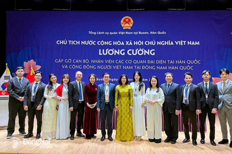 Bích Vân (thứ 4 từ trái qua) chụp hình cùng các đại biểu trong buổi gặp gỡ giữa Ủy viên Bộ Chính trị, Chủ tịch nước Lương Cường với cộng đồng người Việt tại Hàn Quốc. Ảnh: NVCC