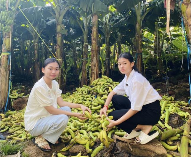 Nhóm học sinh Tsần Thúy Ngọc - Phạm Võ Như Ngọc (Trường THCS Nguyễn Chí Thanh, xã Phú Lộc, H.Tân Phú) đi gom chuối để chế biến thức ăn gia súc (ảnh: Thu Hồng)