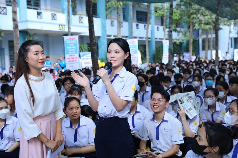Trả lời câu hỏi của học sinh là học ngành gì để không bị AI thay thế trong tương lai, cô Cẩm Tú cho rằng, trước tiên các em phải lựa chọn được ngành nghề đúng khả năng, sở thích, đam mê của mình. Học ở đâu hay học ngành gì không quá quan trọng nếu bản thân các em không nỗ lực và cố gắng. Không chỉ học các kiến thức chuyên ngành, các em phải có thêm kiến thức về ngoại ngữ, có kỹ năng mềm, kỹ năng nghề nghiệp tốt, có phẩm chất đạo đức tốt… để có thể đáp ứng yêu cầu công việc trong tương lai.