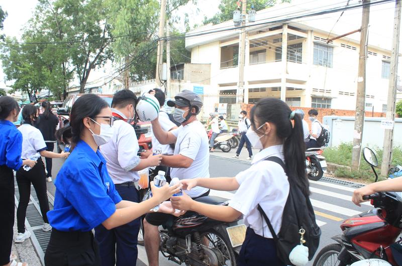 Các tình nguyện viên tiếp sức các thí sinh tham gia kỳ thi tuyển sinh vào lớp 10 tại Trường THPT Trấn Biên (TP.Biên Hòa)