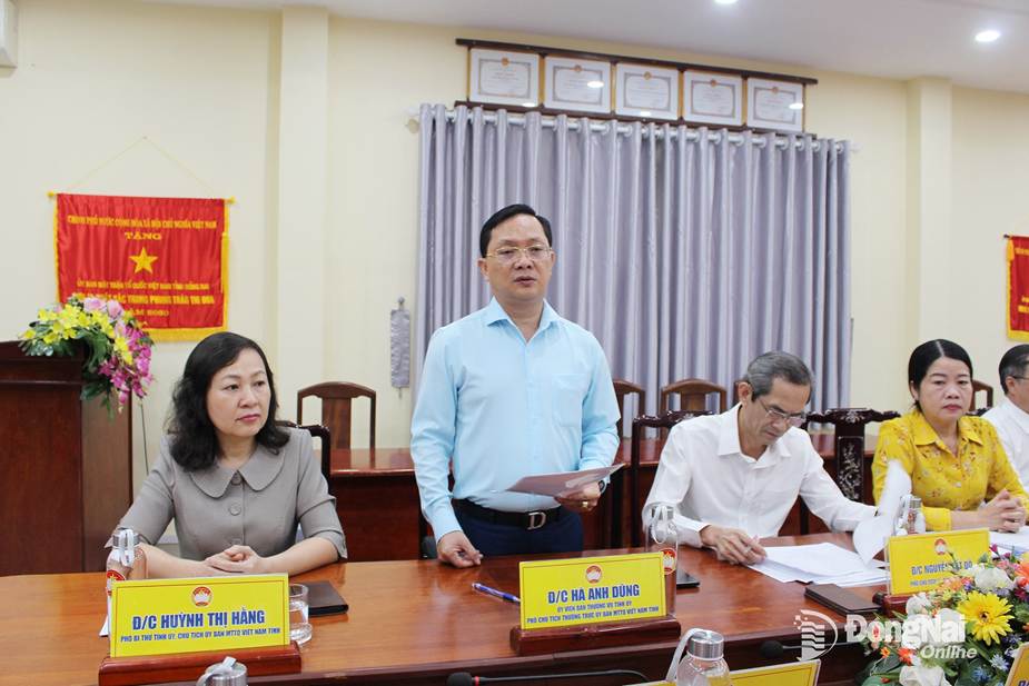 Đồng chí Hà Anh Dũng, Ủy viên Ban Thường vụ Tỉnh ủy, Phó Chủ tịch Thường trực Ủy ban MTTQ Việt Nam tỉnh Đồng Nai phát biểu tại hội nghị. Ảnh: Hồ Thảo