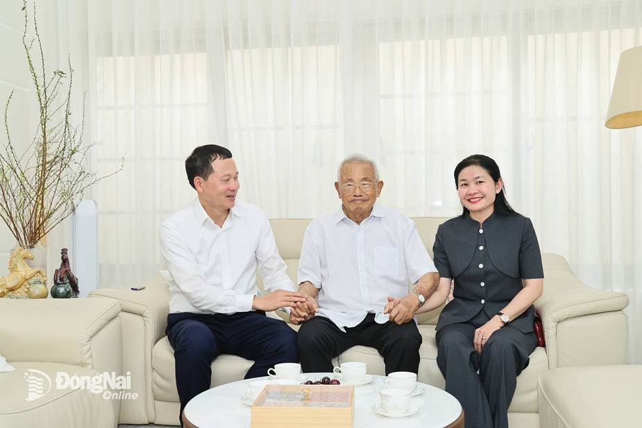 Đồng chí Vũ Hồng Văn, Ủy viên Trung ương Đảng, Bí thư Tỉnh ủy, Trưởng đoàn Đại biểu Quốc hội tỉnh và đồng chí Tôn Ngọc Hạnh, Ủy viên Trung ương Đảng, Phó Bí thư Thường trực Tỉnh ủy, Chủ tịch HĐND tỉnh ân cần hỏi thăm sức khỏe đồng chí Phan Văn Trang, nguyên Bí thư Tỉnh ủy Đồng Nai. Ảnh: Công Nghĩa