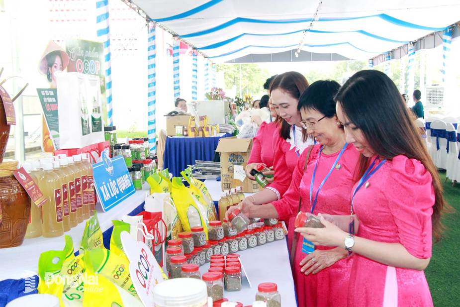 Các đại biểu tham quan gian hàng trưng bày sản phẩm khởi nghiệp của phụ nữ bên lề đại hội. Ảnh: Nga Sơn