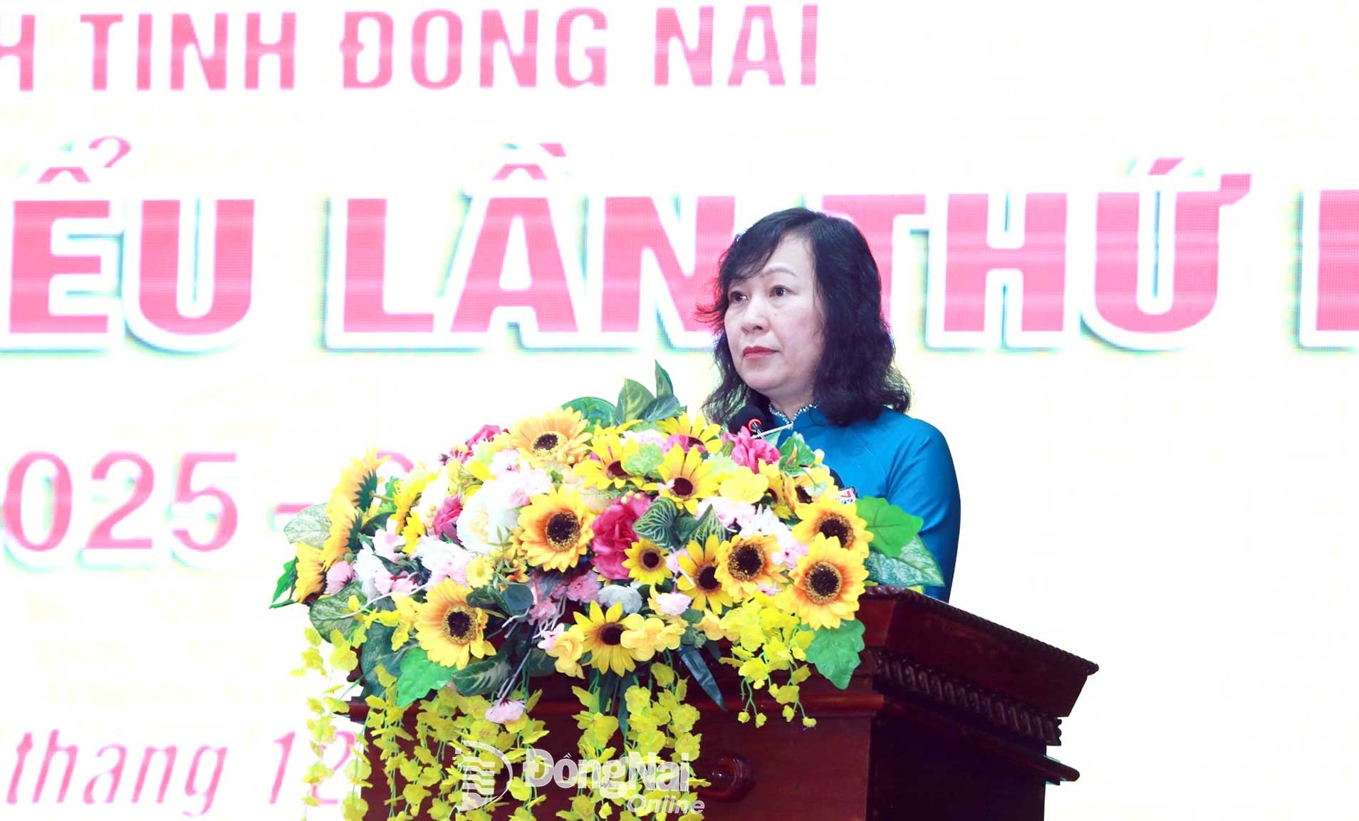 Đồng chí Huỳnh Thị Hằng, Phó Bí thư Tỉnh ủy, Chủ tịch Ủy ban MTTQ Việt Nam tỉnh Đồng Nai phát biểu tại đại hội. Ảnh: Huy Anh