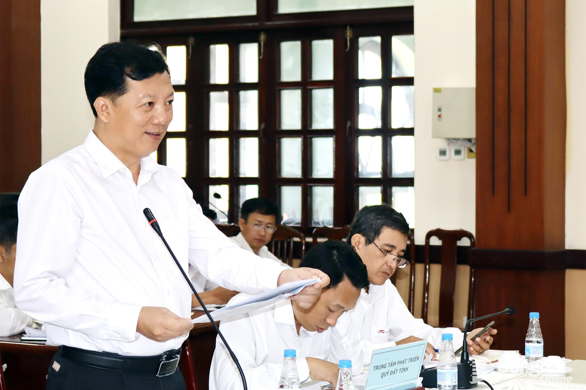 | Ông Chu Tiến Dũng, Phó Giám đốc Trung tâm Phát triển quỹ đất tỉnh báo cáo công tác bồi thường, giải phóng mặt bằng các dự án. Ảnh: Hoàng Lộc |