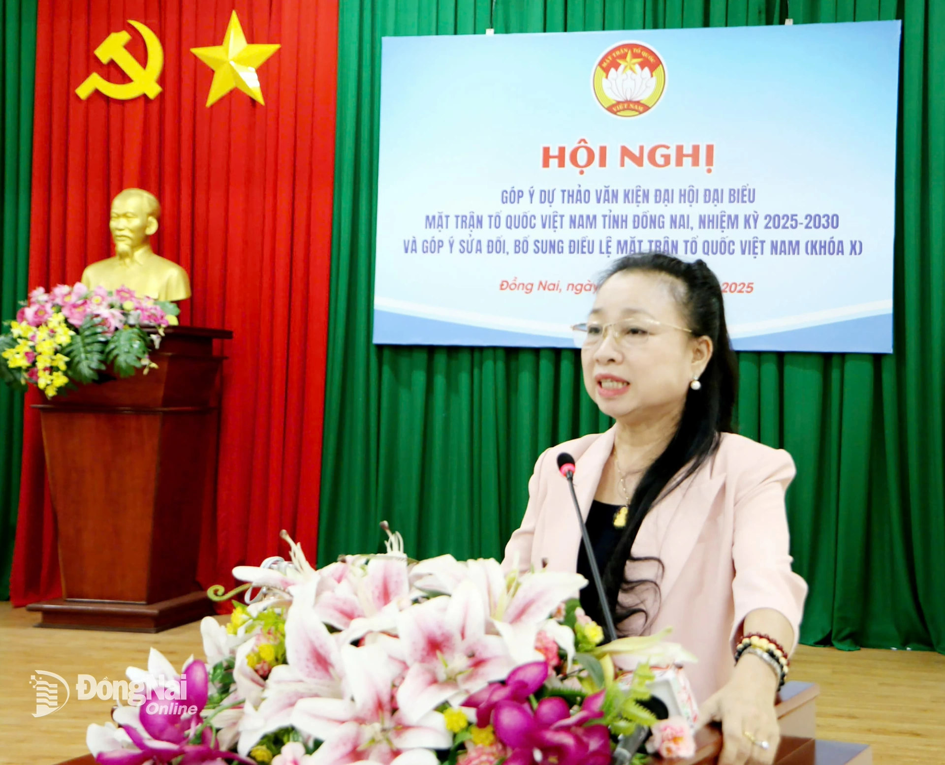 | Phó Bí thư Tỉnh ủy, Chủ tịch Ủy ban MTTQ Việt Nam tỉnh Đồng Nai Huỳnh Thị Hằng phát biểu tại hội nghị. Ảnh: Văn Truyên |