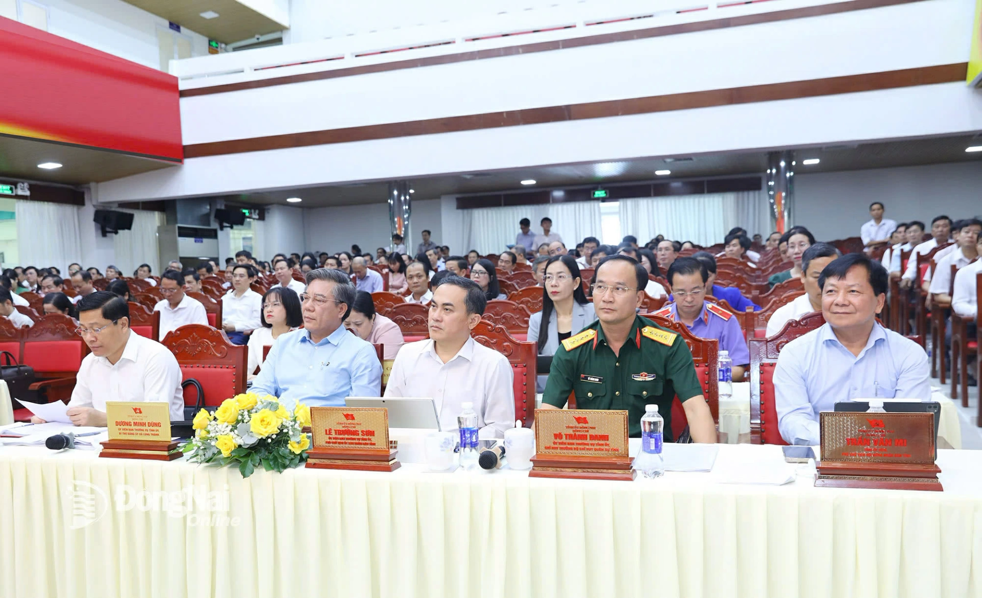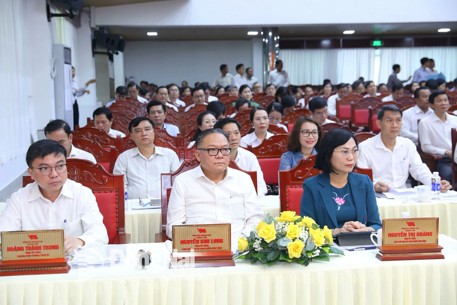 Các đồng chí: Vũ Hồng Văn, Bí thư Tỉnh ủy, Trưởng đoàn Đại biểu Quốc hội tỉnh Đồng Nai; Tôn Ngọc Hạnh, Ủy viên dự khuyết Trung ương Đảng, Phó Bí thư Thường trực Tỉnh ủy, Chủ tịch HĐND tỉnh Đồng Nai; Võ Tấn Đức, Phó Bí thư Tỉnh ủy, Chủ tịch UBND tỉnh Đồng Nai; Huỳnh Thị Hằng, Phó Bí thư Tỉnh ủy, Chủ tịch Ủy ban MTTQ Việt Nam tỉnh Đồng Nai; Thái Bảo, Phó Bí thư Tỉnh ủy, Trưởng ban Tổ chức Tỉnh ủy Đồng Nai chủ trì hội nghị.
