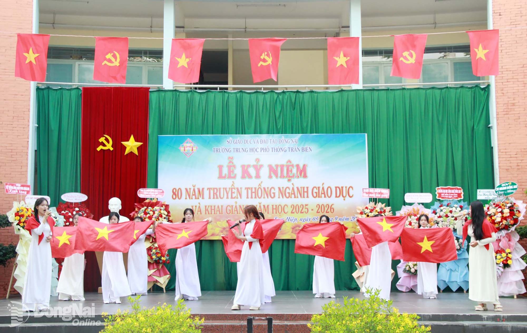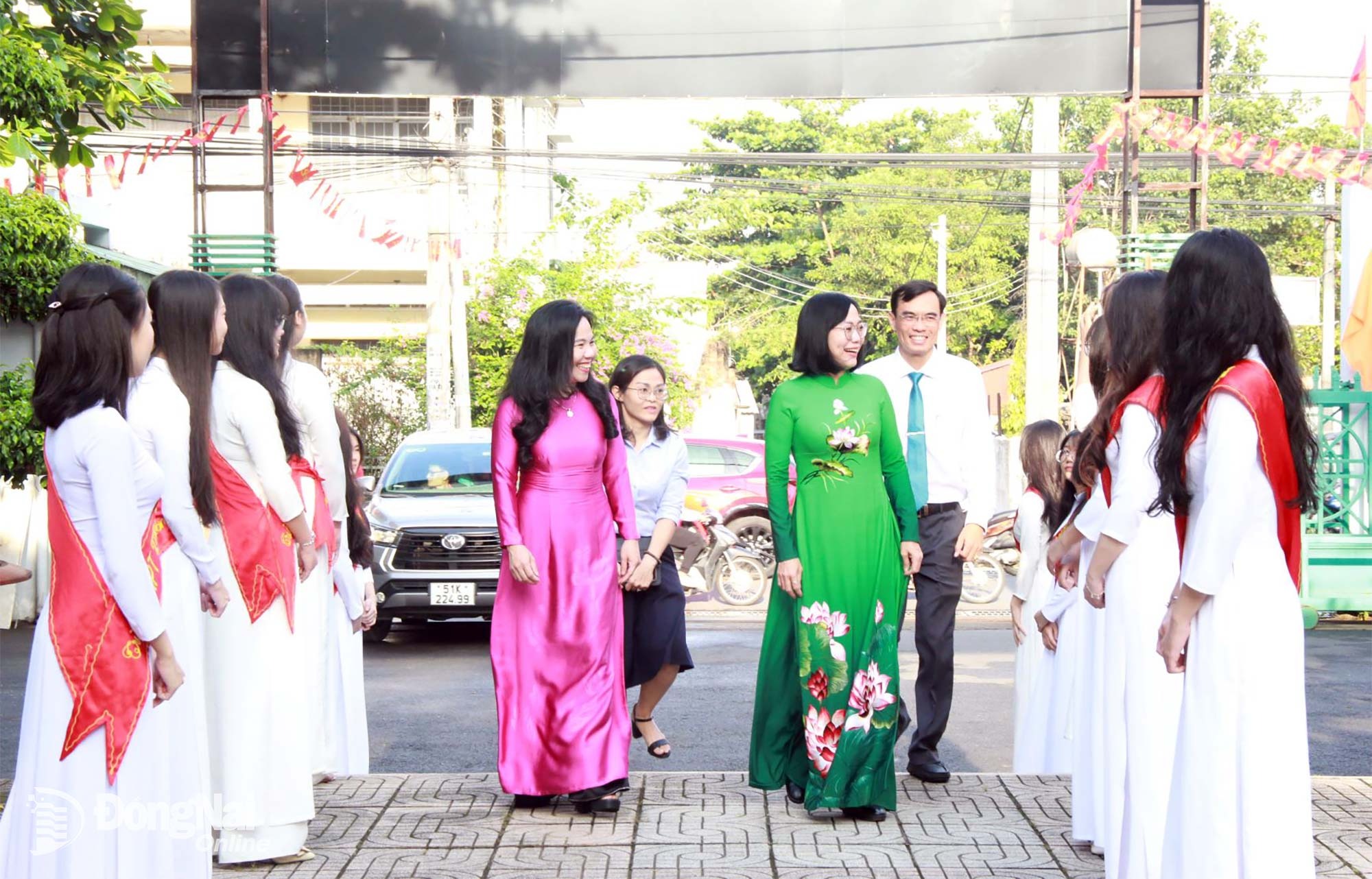 Tỉnh ủy viên, Phó Chủ tịch UBND tỉnh Đồng Nai Nguyễn Thị Hoàng (áo dài xanh) tham dự Lễ khai giảng năm học mới tại Trường THPT Trấn Biên. Ảnh: Nga Sơn
