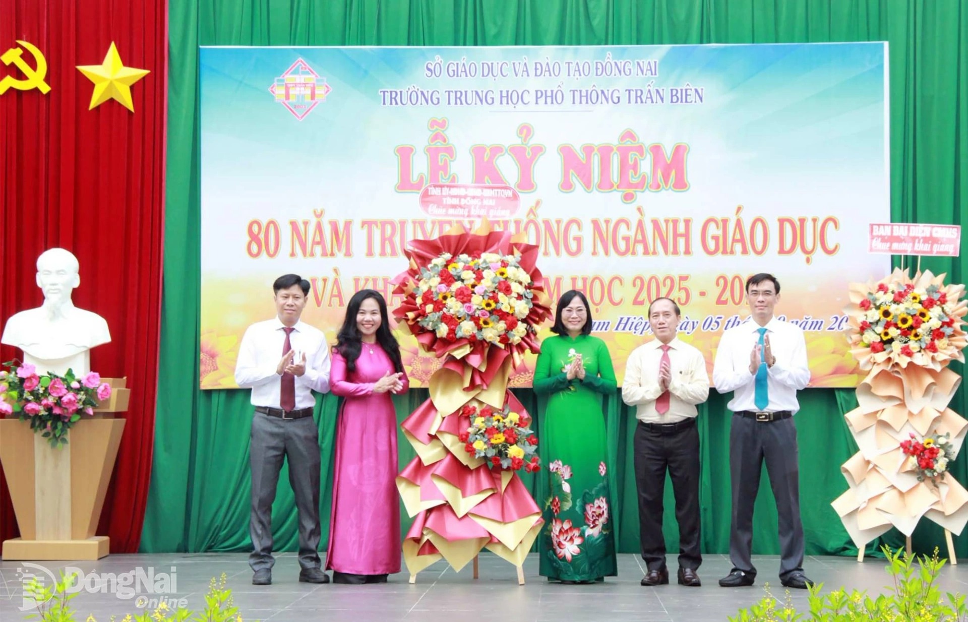 Tỉnh ủy viên, Phó Chủ tịch UBND tỉnh Đồng Nai Nguyễn Thị Hoàng (thứ 3 từ phải sang) tặng lẵng hoa của Tỉnh ủy - HĐND - UBND - Ủy ban MTTQ Việt Nam tỉnh chúc mừng nhà trường. Ảnh: Nga Sơn