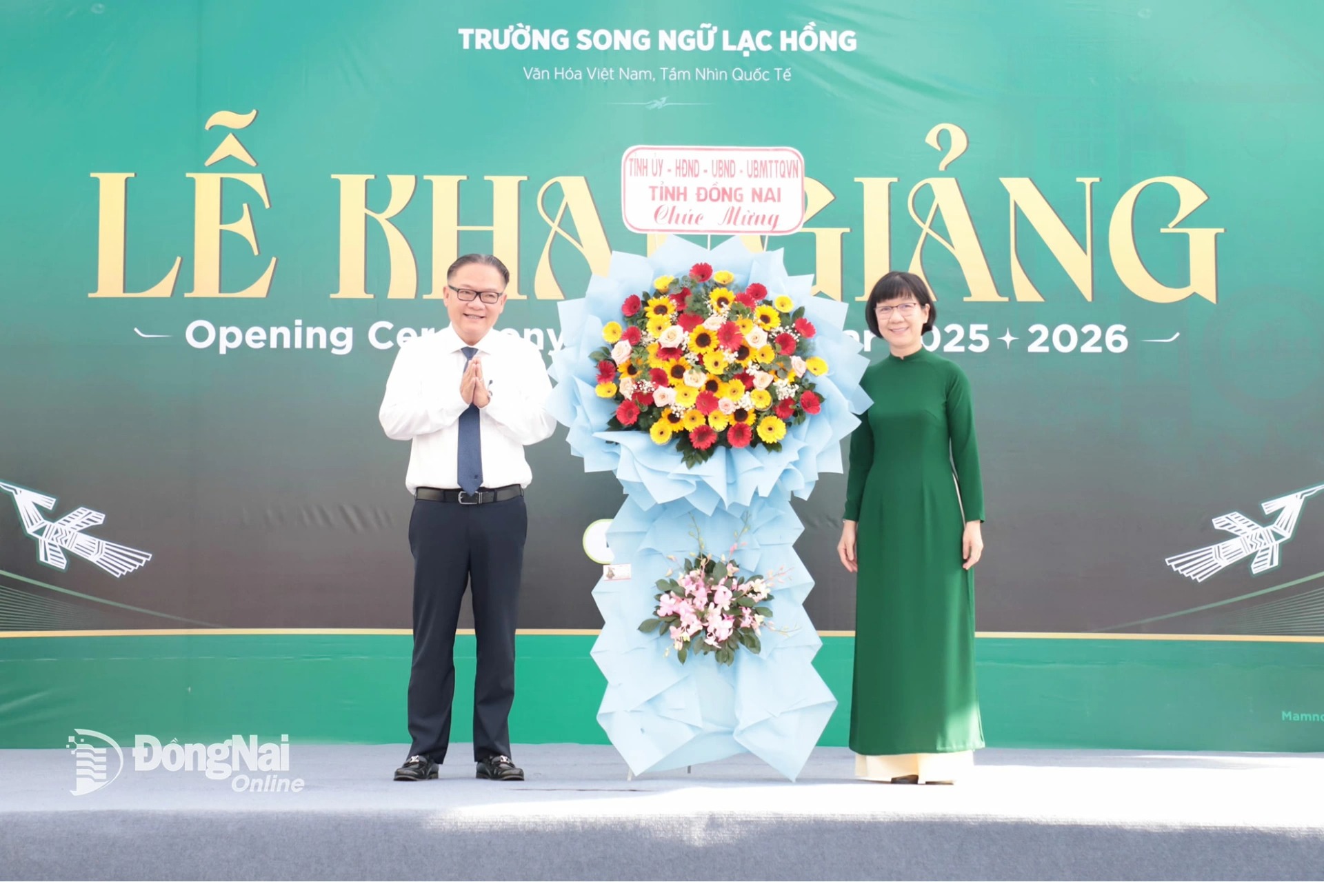 Tỉnh ủy viên, Phó Chủ tịch UBND tỉnh Đồng Nai Nguyễn Kim Long trao hoa chúc mừng tại lễ khai giảng năm học mới của Trường TH-THCS-THPT Song ngữ Lạc Hồng. Ảnh: Cẩm Thành