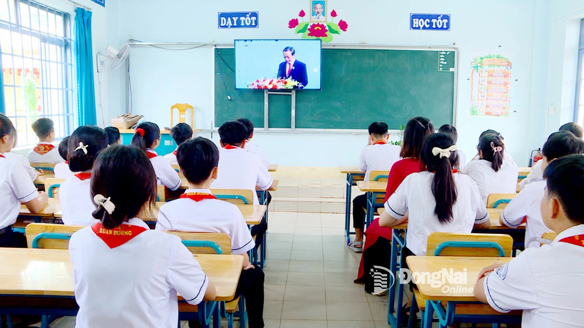 Học sinh Trường THCS Xuân Đường dự Lễ khai giảng được Đài Truyền hình Việt Nam tường thuật trực tiếp. Ảnh: Hoàng Hải