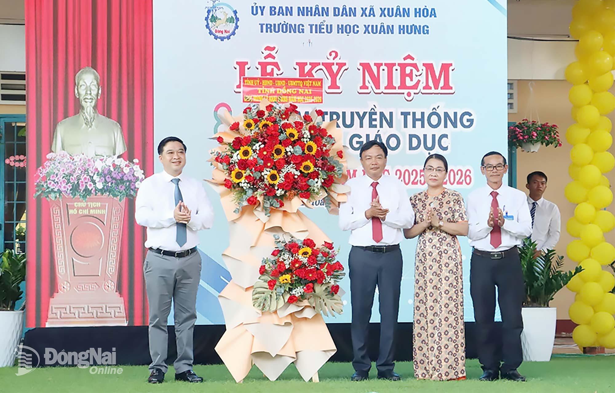 Tỉnh ủy viên, Phó Chủ tịch UBND tỉnh Đồng Nai Hồ Văn Hà tặng hoa chúc mừng tập thể Trường Tiểu học Xuân Hưng. Ảnh: Văn Đoàn