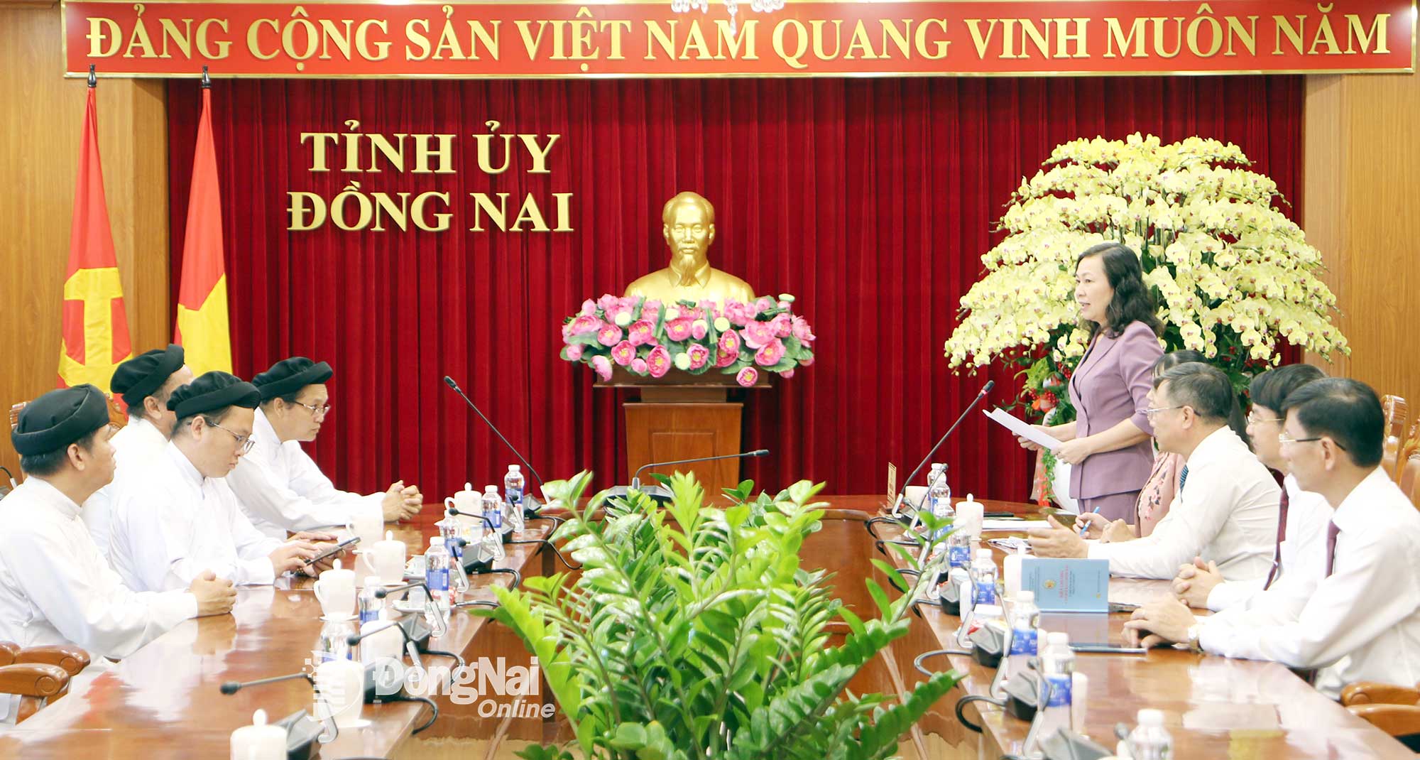 | Phó Bí thư Tỉnh ủy, Chủ tịch Ủy ban MTTQ Việt Nam tỉnh Đồng Nai Huỳnh Thị Hằng phát biểu tại buổi gặp mặt đoàn Hội Thánh Cao Đài Ban Chỉnh đạo. Ảnh: Văn Truyên |