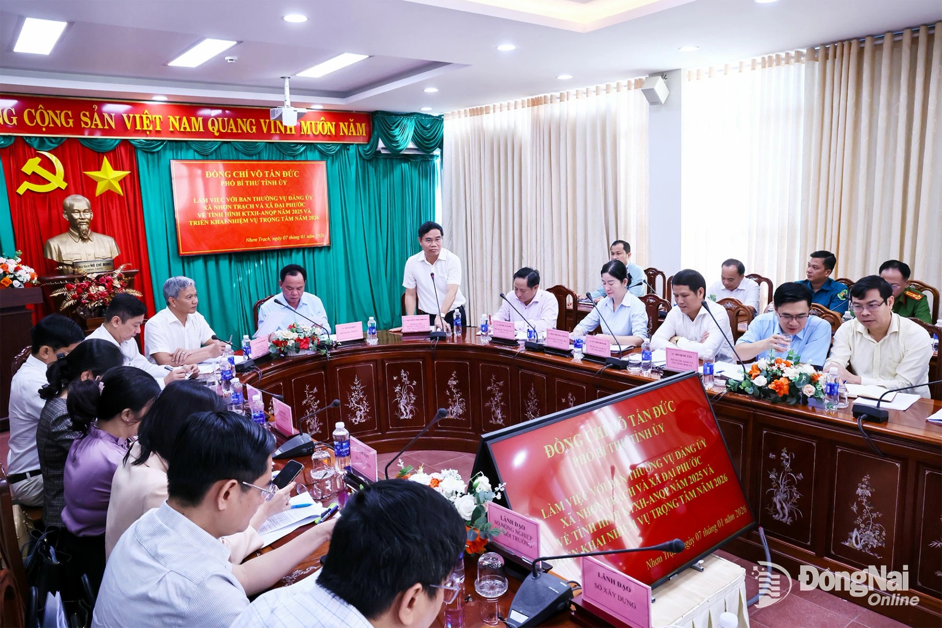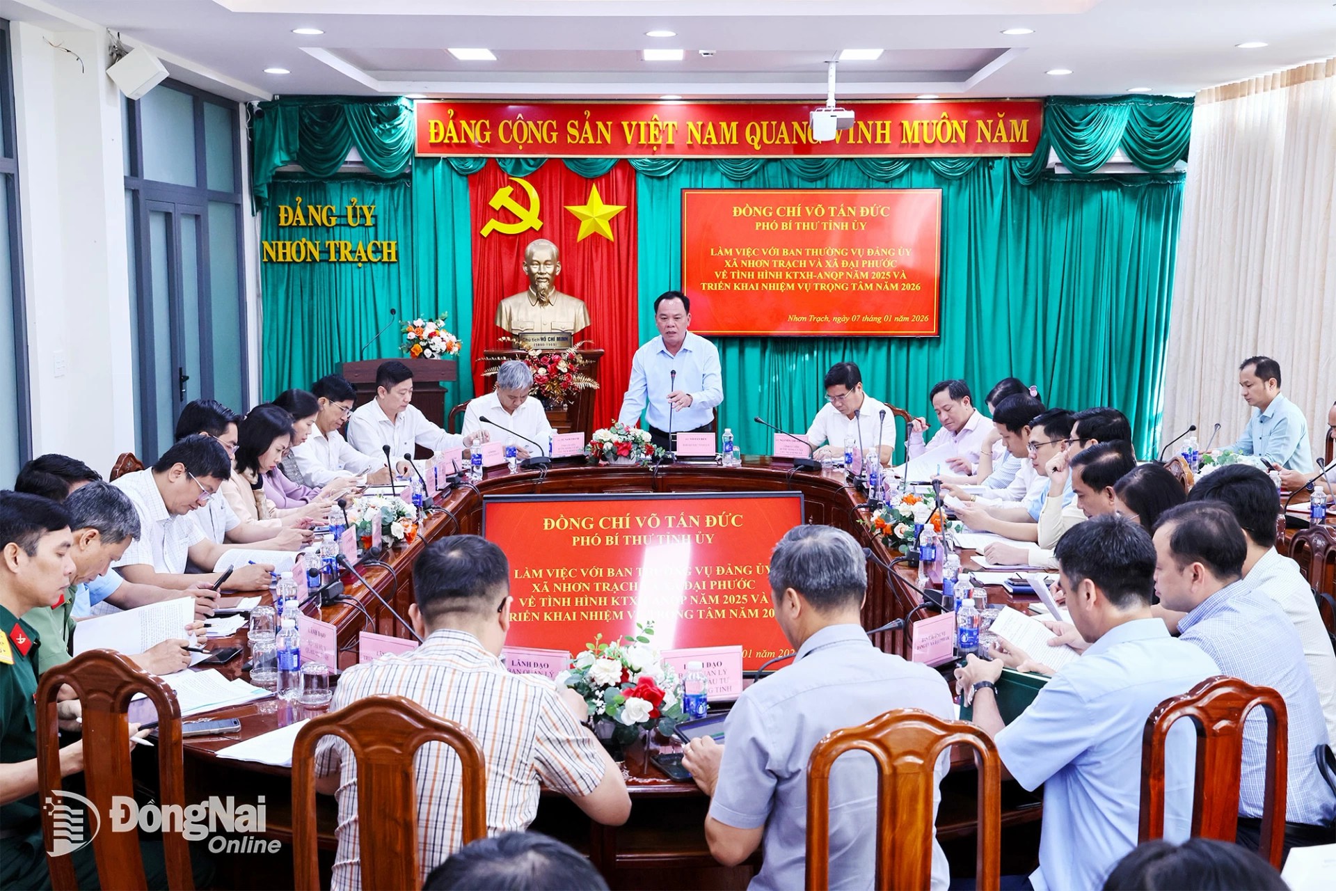 Nhấn mạnh nhiệm vụ trọng tâm trong năm 2026, đồng chí Võ Tấn Đức đề nghị 2 xã Nhơn Trạch và Đại Phước sớm hoàn chỉnh chương trình hành động năm 2026, phát huy tinh thần đoàn kết, đổi mới để thực hiện thắng lợi nghị quyết đại hội Đảng bộ các cấp nhiệm kỳ 2025-2030. Trong đó, Ban Thường vụ Đảng ủy cấp xã cần chú trọng nâng cao năng lực lãnh đạo của chi bộ khu phố, thực hiện nghiêm nguyên tắc tập trung dân chủ và nêu gương người đứng đầu, đặc biệt cần quan tâm đào tạo cán bộ trẻ để thích ứng nhanh với mô hình quản lý mới.