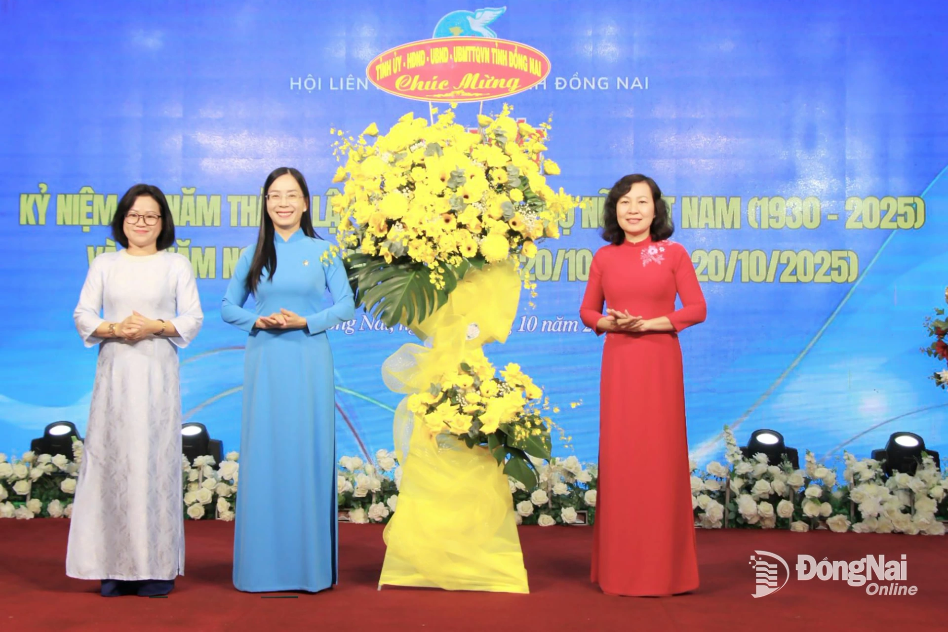 | Đồng chí Huỳnh Thị Hằng, Phó Bí thư Tỉnh ủy, Chủ tịch Ủy ban MTTQ Việt Nam tỉnh Đồng Nai tặng lẵng hoa của Tỉnh ủy - HĐND - UBND - Ủy ban MTTQ Việt Nam tỉnh chúc mừng Hội Liên hiệp Phụ nữ tỉnh nhân kỷ niệm 95 năm Ngày thành lập Hội Liên hiệp phụ nữ Việt Nam. Ảnh: Nga Sơn |