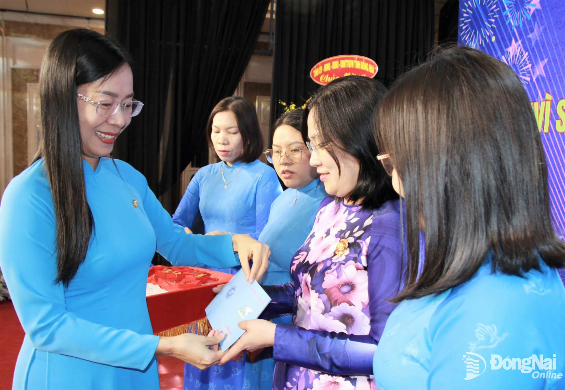| Tỉnh ủy viên, Phó Chủ tịch UBND tỉnh Đồng Nai Nguyễn Thị Hoàng trao bằng khen của UBND tỉnh cho cá nhân đạt thành tích xuất sắc trong Phong trào Thi đua xây dựng người phụ nữ Việt Nam thời đại mới. Ảnh: Nga Sơn |