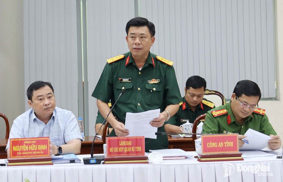 Thượng tá Phạm Minh Trí, Phó Chỉ huy trưởng Bộ Chỉ huy Quấn sự tỉnh báo cáo tại cuộc họp. Ảnh: Nguyệt Hà