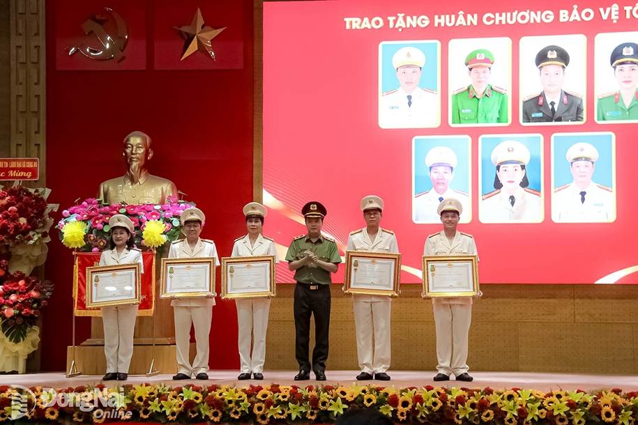 Thừa ủy quyền của Chủ tịch nước, Trung tướng Đặng Hồng Đức, Thứ trưởng Bộ Công an trao tặng Huân chương Bảo vệ Tổ quốc cho các cá nhân đạt thành tích. Ảnh: Trần Danh
