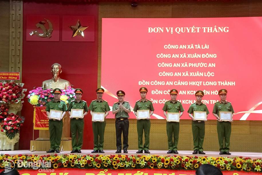 Thiếu tướng Nguyễn Đức Hải, Ủy viên Ban Thường vụ Tỉnh ủy, Giám đốc Công an tỉnh Đồng Nai trao khen thưởng cho các đơn vị quyết thắng. Ảnh: Trần Danh