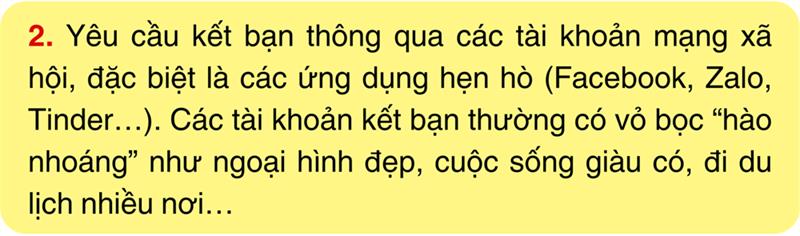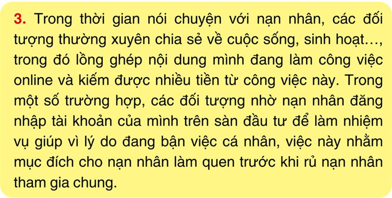 Chúng lập ra nhiều tài khoản mạng xã hội ảo, lấy ảnh, thông tin của những người nổi tiếng hoặc có ngoại hình ưa nhìn, vỏ bọc doanh nhân, nhắn tin trò chuyện trong thời gian dài với nạn nhân. Trong khi trò chuyện, các đối tượng chia sẻ việc mình kiếm được nhiều tiền thông qua công việc đầu tư, làm nhiệm vụ qua mạng, lôi kéo nạn nhân tham gia cùng nhằm chiếm đoạt tài sản.