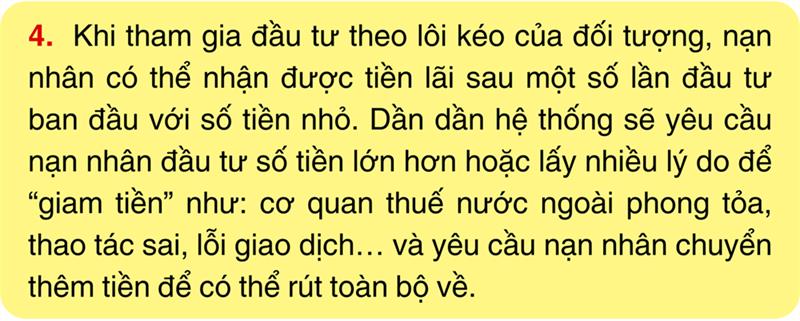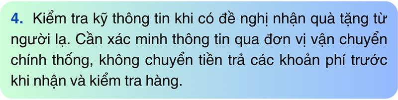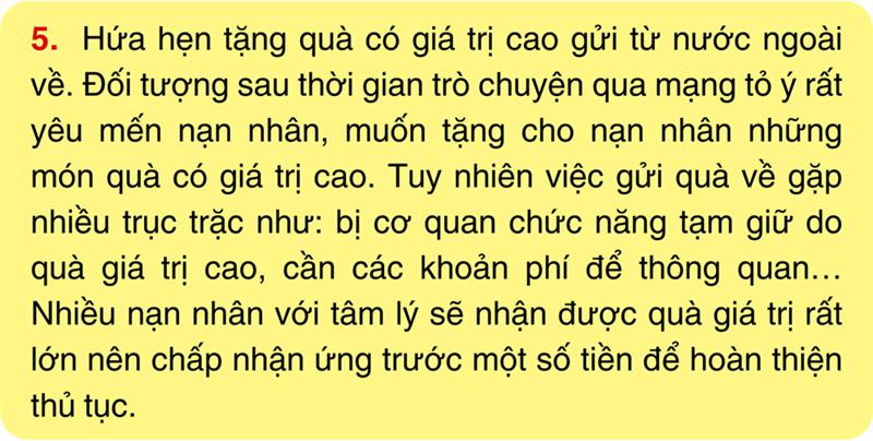 Ngoài ra, đối tượng có thể tự xưng mình là người nước ngoài, ngỏ ý muốn gửi quà tặng có giá trị cao cho nạn nhân, sau đó giả danh các cơ quan chức năng (Công an, Thuế, Hải quan…) đề nghị nạn nhân đóng các khoản phí để nhận được quà.