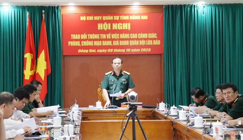 (CTT- Đồng Nai) – Đại tá: Vũ Văn Điền, Ủy viên Ban TVTU, Chỉ huy trưởng Bộ Chỉ huy quân sự (CHQS) tỉnh chủ trì hội nghị trao đổi thông tin về việc nâng cao cảnh giác phòng chống mạo danh, giả danh quân đội lừa đảo. Cùng dự có đại tá Bùi Đăng Ninh, Chính ủy Bộ CHQS tỉnh và các đồng chí trong Đảng ủy, Bộ CHQS tỉnh; đại diện Ban Tuyên giáo Tỉnh ủy, Sở TT-TT và các cơ quan thông tấn, báo chí Trung ương, địa phương…