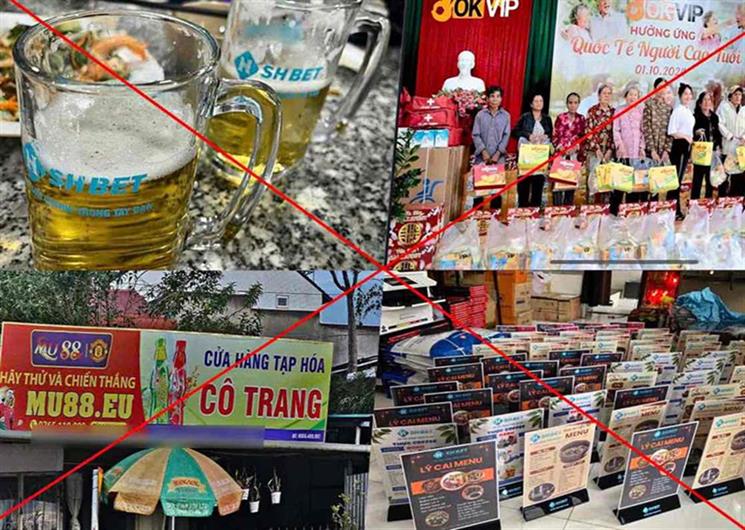 Các logo quảng cáo trá hình cho các trang web, ứng dụng đánh bạc trực tuyến xuất hiện tại các cửa hàng, các buổi từ thiện.