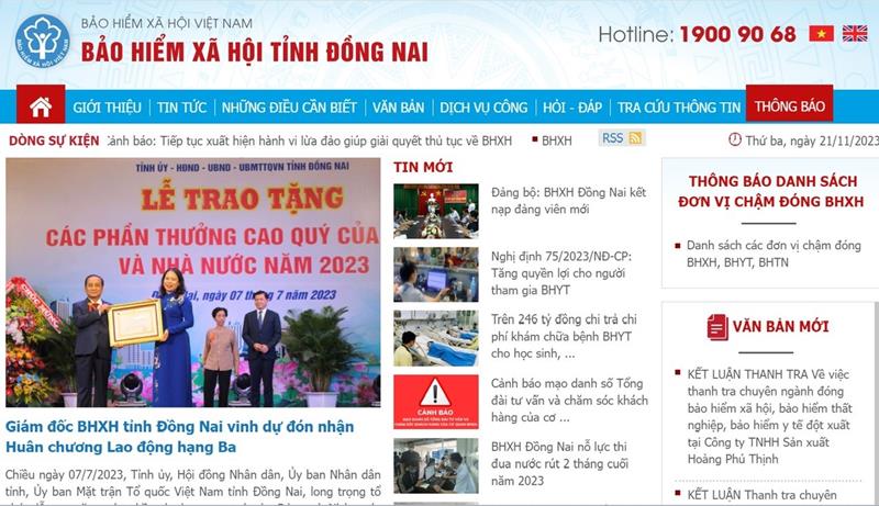 Giao diện trang web của Bảo hiểm xã hội tỉnh Đồng Nai