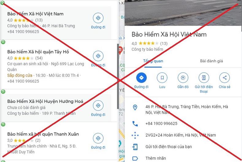 Tuy nhiên hiện nay, trên trang Google Map (https://www.google.com/maps), phần thông tin Tổng đài liên hệ của BHXH Việt Nam và một số BHXH tỉnh, thành phố như Hà Nội, TP. Hồ Chí Minh, Hải Dương, Ninh Bình, BHXH một số quận, huyện đã bị đối tượng mạo danh chỉnh sửa, không chính xác. Các Tổng đài này đều có chung đầu số 1900.9966.xx.