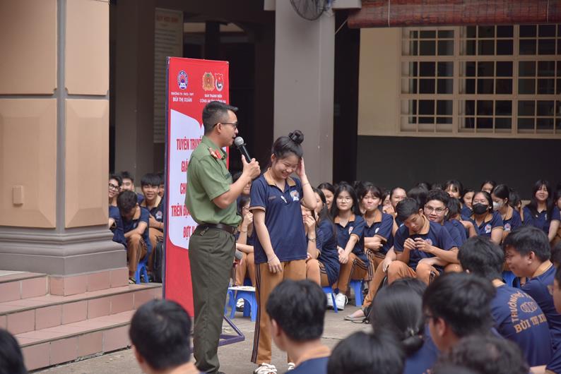 Cán bộ Đoàn thanh niên Công an tỉnh tuyên truyền pháp luật cho các em học sinh trên địa bàn thành phố Biên Hòa